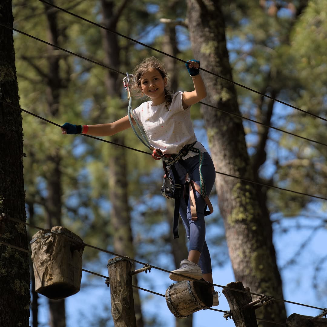 Circuitos multiaventura: tirolinas, rocódromo y juegos de equilibrio suspendidos en los árboles.